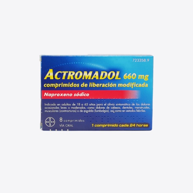 Actromadol 660 mg 8 comprimidos es un medicamento que contiene naproxeno sódico, un principio activo con acción antiinflamatoria no esteroideo (AINEs) que se utiliza para el tratamiento del dolor y/o fiebre en adultos.