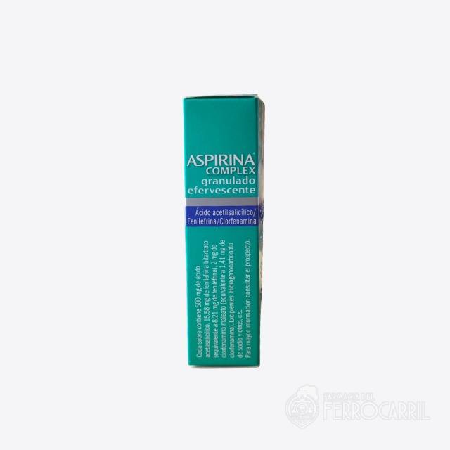 Aspirina Complex granulado efervescente 10 sobres es una asociación de ácido acetilsalicílico, analgésico que actúa sobre el dolor y la fiebre, clorfenamina, antihistamínico que reduce el estornudo y el lagrimeo y fenilefrina, vasoconstrictor que actúa sobre la congestión nasal.