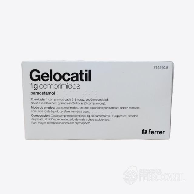 Gelocatil 1g 10 comprimidos, cada comprimido contiene: 1g de paracetamol. Excipientes: almidón de patata, almidón pregelatinizado de maíz y otros excipientes.