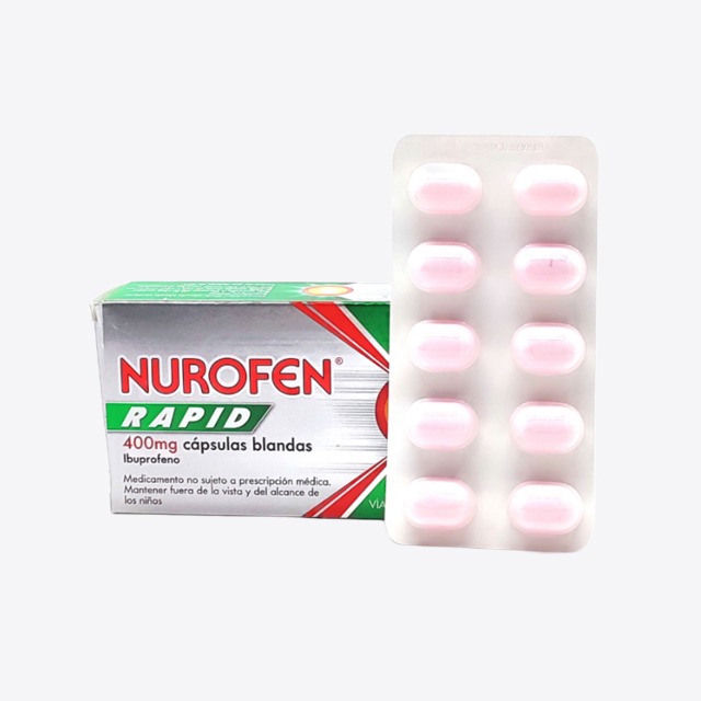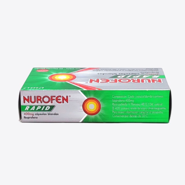 Nurofen rapid 400mg 20 cápsulas blandas esta indicado en adultos y adolescentes mayores de 12 años para el alivio sintomatico del dolor ocasional leve o moderado, como dolor de cabeza, dental, menstrual, muscular (contracturas) o de espalda (lumbago), así como en estados febriles.