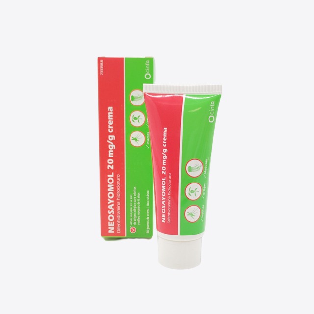 Neosayamol 20mg/g crema es una crema compuesta por un antihistamínico, la difenhidramina que por su forma de actuar resulta efectivo para aliviar el picor en cuadros alérgicos.