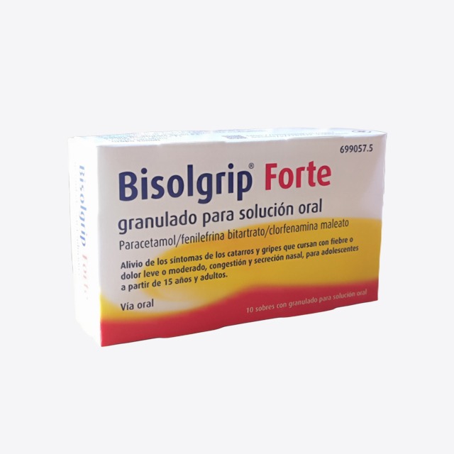 Bisolgrip Forte 10 sobres es una asociación de paracetamol, clorfenamina y fenilefrina.