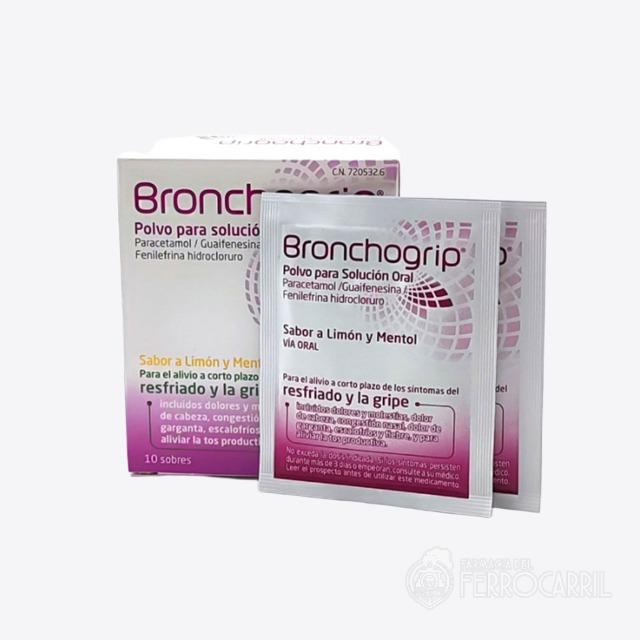 Bronchogrip 10 sobres es un medicamento que contiene Paracetamol, análgésico que alivia los dolores, como el de cabeza, garganta y es antipirético, baja la fiebre. Guaiafenesina, expectorante que fluidifica el moco cuando se tiene tos productiva. Fenilefrina clorhidrato, descongestionante que reduce la inflamación de los conductos nasales y facilita la respiración.