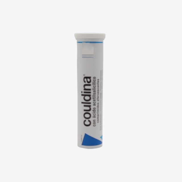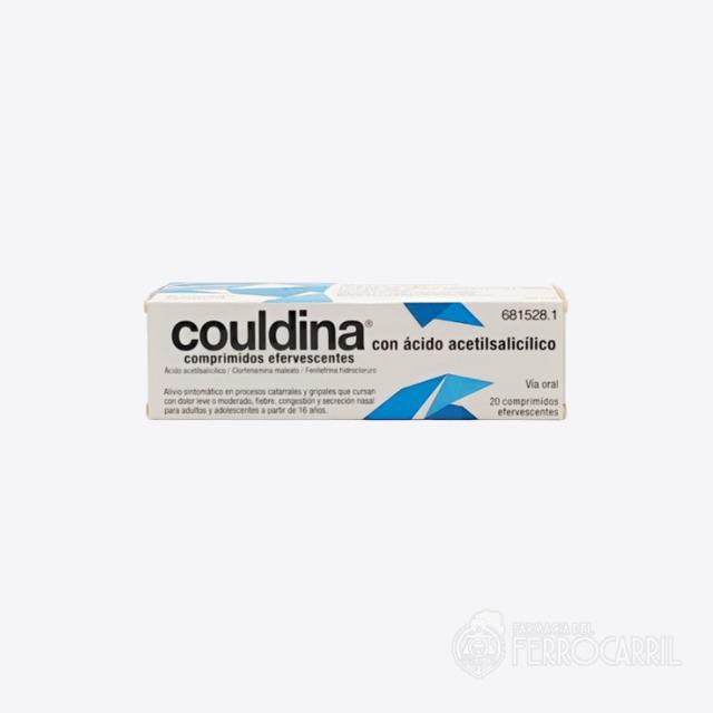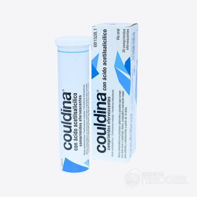 Couldina con ácido acetilsalicílico 20 comprimidos efervescentes se utiliza para el alivio sintomático en procesos catarrales y gripales que cursan con solor leve o moderado, fiebre, congestión y secreción nasal para adultos y adolescentes a partir de 16 años.