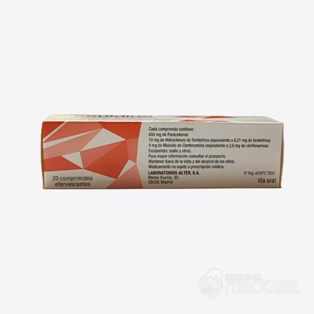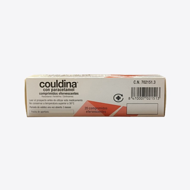 Couldina con paracetamol 20 comprimidos efervescentes cada comprimido contiene 650 mg de paracetamol, 10 mg de hidrocloruro de fenilefrina, 4 mg de maleato de clorfenamina y como excipientes: sodio y otros. Para mayor información consultar el prospecto.