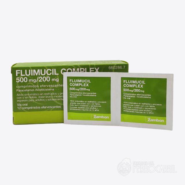 Fluimucil complex 500 mg/200 mg 12 comprimidos efervescentes se utiliza para el alivio sintomático en resfriados y procesos gripales que cursen con o sin fiebre, dolor leve o moderado y secreciones mucosas espedad para adultos y adolescentes mayores de 12 años.