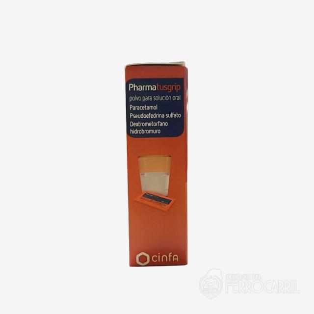 Pharmatusgrip 10 sobres contiene en cada sobre 500 mg de paracetamol, 30 mg de pseudoefedrina sulfato y 15 mg de dextrometorfano hidrobromuro. Sacarosa, sorbitol (E-420), amaranto (E-123), sodio y otros excipientes.