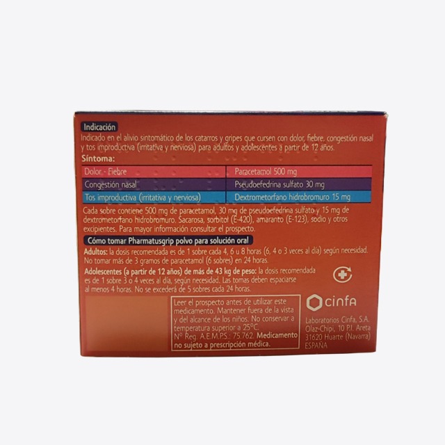 Pharmatusgrip 10 sobres está indicado para el alivio sintomático de los catarros y gripes que cursen con dolor, fiebre, congestión nasal y tos productiva (irritativa y nerviosa) para adultos y adolescentes a partir de 12 años.