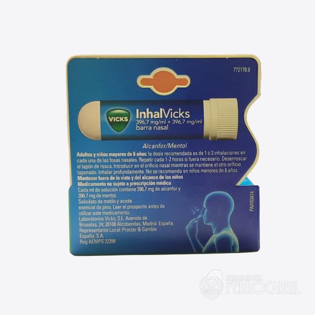 Inhalvicks barra nasal 1 ml es un medicamento no sujeto a prescripción médica. Inhalvicks barra nasal 1 ml en cada ml de solución contiene 369,7 mg de alcanfor y 396.7 mg de mentol. Salicilato de metilo y aceite esencial de pino. Leer el prospecto antes de utilizar este medicamento.