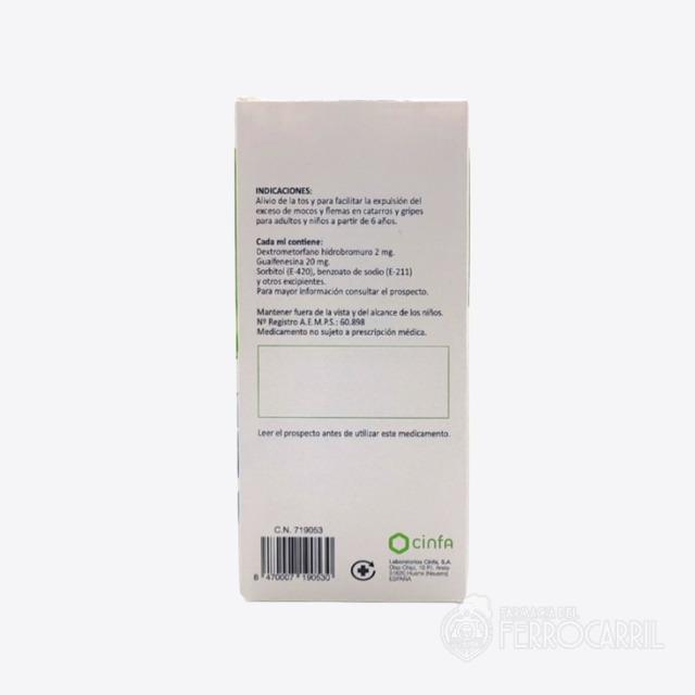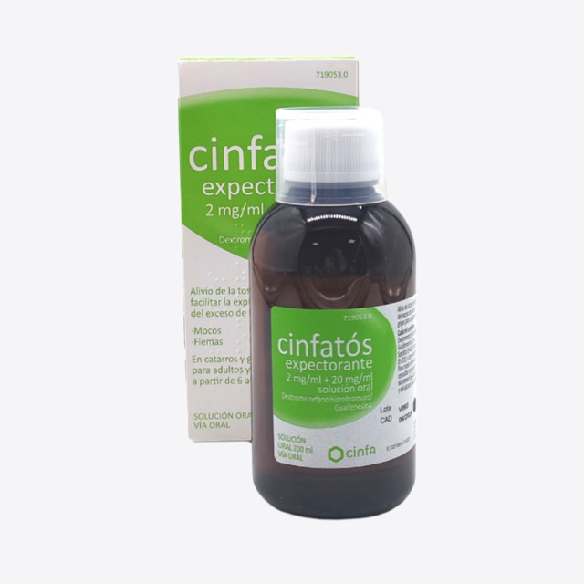 Cinfatos expectorante 200 ml es un medicamento que contiene dextrometorfano hidrobromuro que es un antitusivo y guaifenesina que es un expectorante.