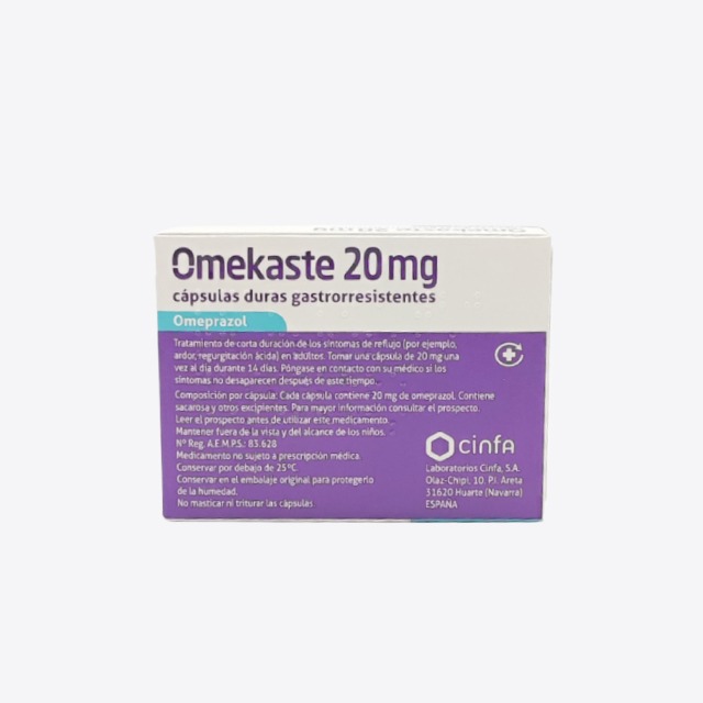 Omekaste 20 mg 14 cápsulas gastrorresistenes contiene como principio activo omeprazol. Es un medicamento que pertenece al grupo de los denominados “inhibidores de la bomba de protones”, que reducen el ácido producido por el estómago. Por tanto, se utiliza para el alivio y tratamiento de corta duración de los síntomas del reflujo (como pueden ser ardor o regurgitación ácida).
