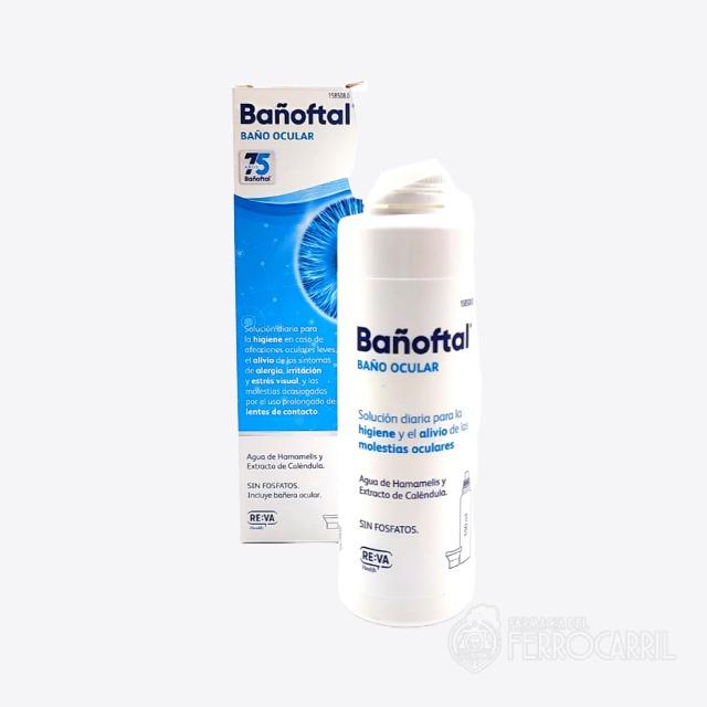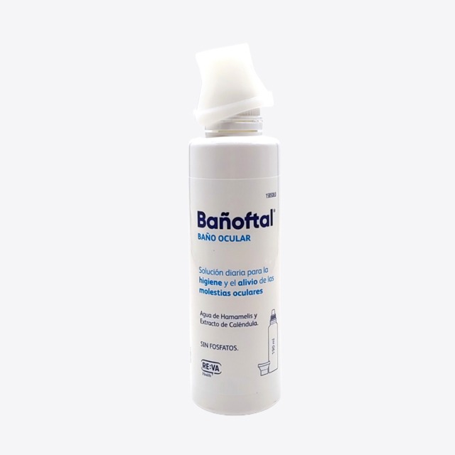 Bañoftal baño ocular 190 ml es una solución líquida de uso diario para la higiene en profundidad del ojo y el alivio de los síntomas que causan picor, lagrimeo, enrojecimiento y molestias oculares, a base de agua de Hamamelis (descongestionanate y antiinflamatorio) y extracto de caléndula (antiséptico), que proporciona una agradable sensación de frescor y bienestar ocular.
