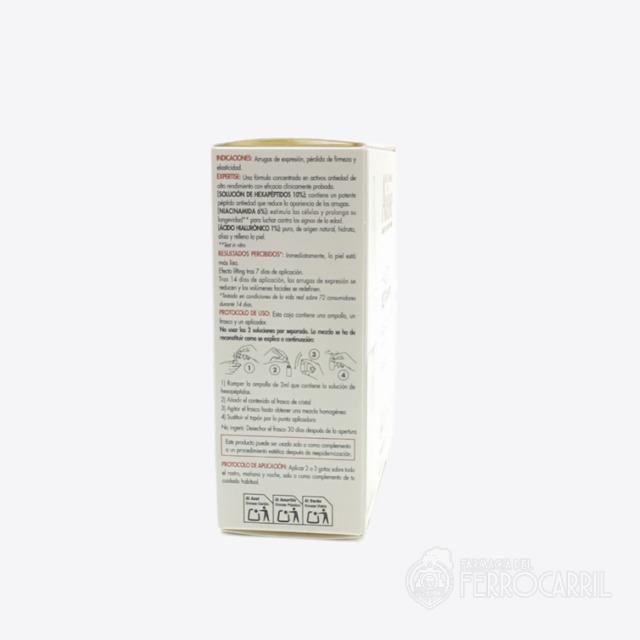 - Solución de hexapéptidos 10%: contiene un potente péptido antiedad que reduce la apariencia de las arrugas.