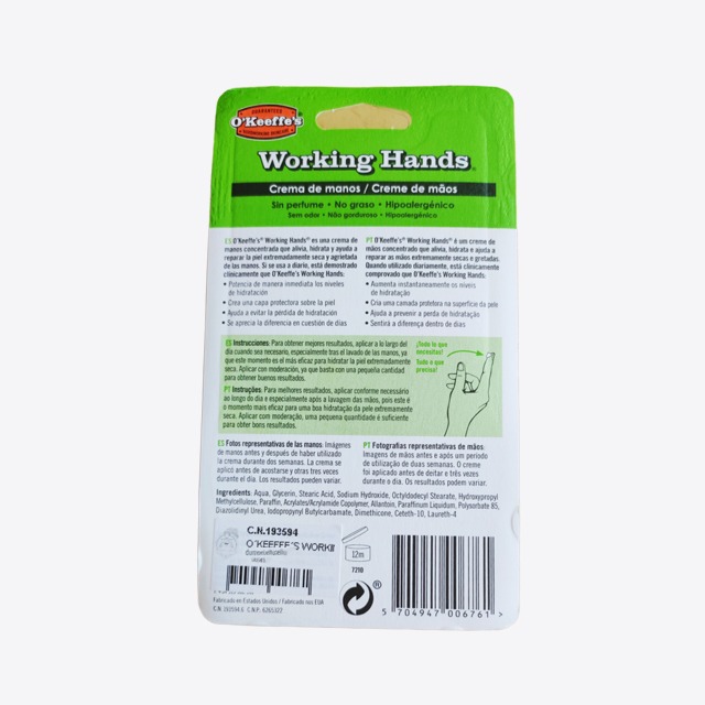O'Keeffe's working hands 96g es una crema de manos concentrada que alivia, hidrata y ayuda a reparar la piel extremadamente seca y agrietada de las manos. Si se usa a diario, está demostrado clínicamente que O'Keeffe's working hands 96g: