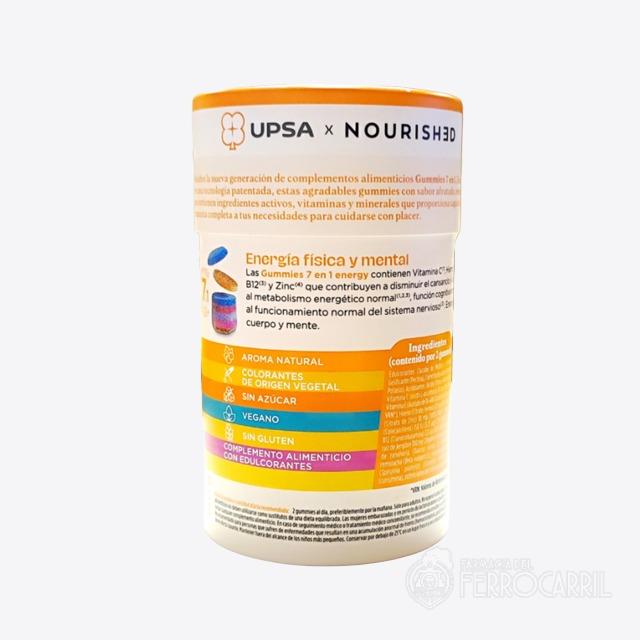 Además Energy UPSA 30 gummies sabor afrutado tambien contiene: Vitamina E, Vitamina D y extracto de jengibre.