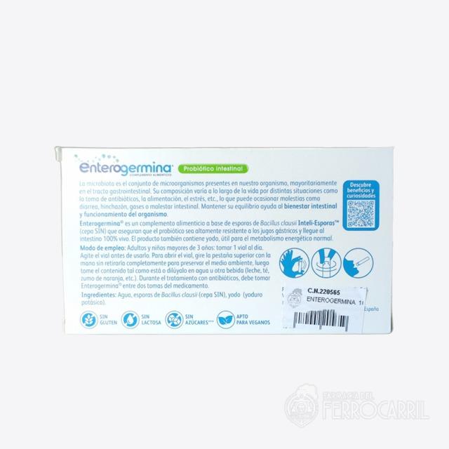 Enterogermina 10 viales es un complemento alimenticio a base de esporas de Bacillus clausii Inteli-Esporas (cepa SIN) que aseguran que el probiótico sea altamente resistente a los jugos gástricos y llegue al intestino 100% vivo.