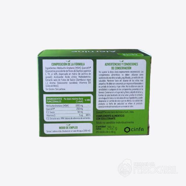 Alernine santé verte 20 sticks contiene Metilsulfonilmetano (MSM), Quercefit, Saúco y Vitamina D3.