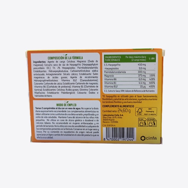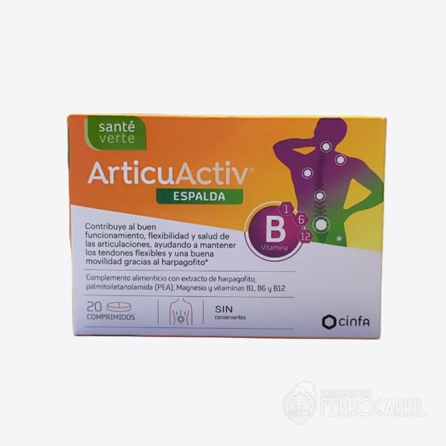Articu Activ espalda 20 comprimidos es un complemento alimenticio con extracto de harpagofito, palmitoiletanolamida (PEA), Magnesio y vitamina B1,B6 Y B12 sin conservantes.
