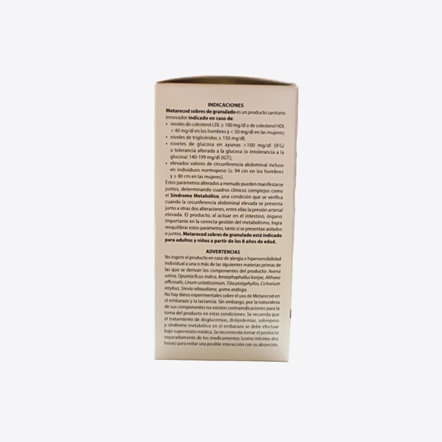 Estos parametros alterados a menudo pueden manifestarse juntos, determinando cuadros clínicos complejos como Síndrome Metabólico, una condición que se verifica cuando la circunferencia abdominal elevada se presenta junto a otras dos alteraciones, entre ellas la presión arterial elevada. Metarecod 40 sobres, al actuar en el intestino, órgano importante en la correcta gestión del metabolismo, logra reequilibrar estos parámetros, tanto si se presentan aislados o juntos. Metarecod 40 sobres está indicado para adultos y niños a partir de los 8 años de edad.