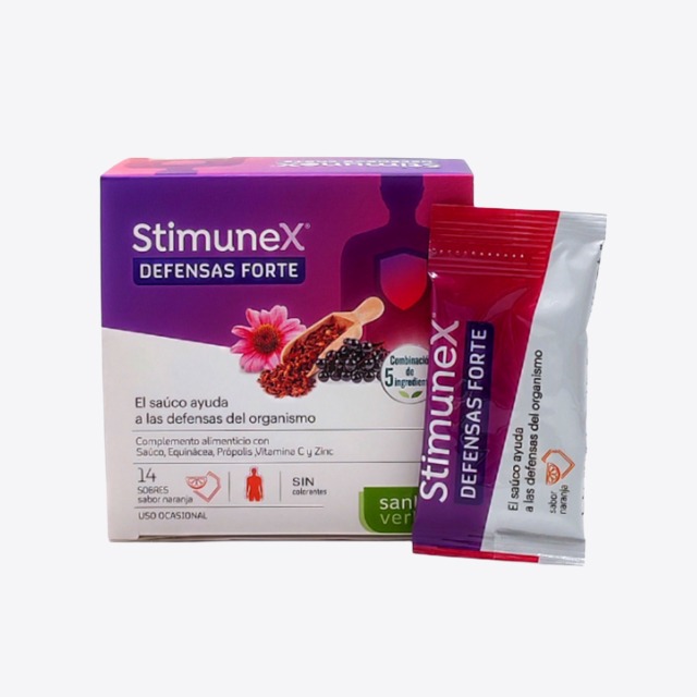 Stimunex defensas forte es un complemento alimenticio a base de Saúco, Equinácea, Própolis, Vitamina C y Zinz. El saúco ayuda a las defensas del organismo. La Equinácea ayuda a la función del sistema defensivo.
