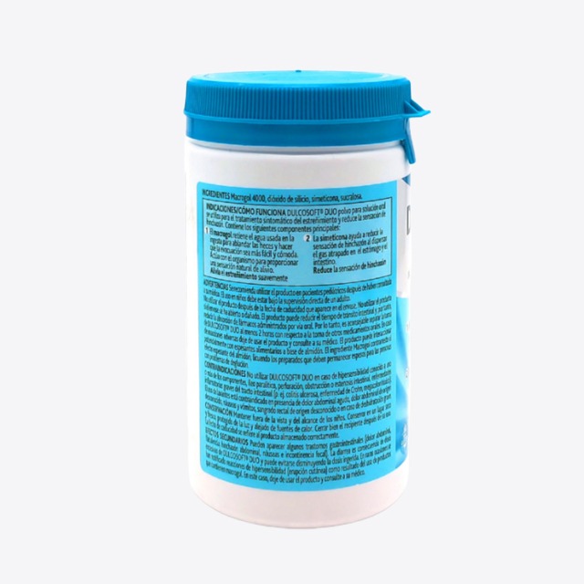 Dulcosoft Duo Macrogol 4000 y Simeticona 200g es un polvo para solución oral, se utiliza para el tratamiento sintomático del estreñimiento y reduce la sensación de hinchazón. Contiene los siguientes componentes principales: