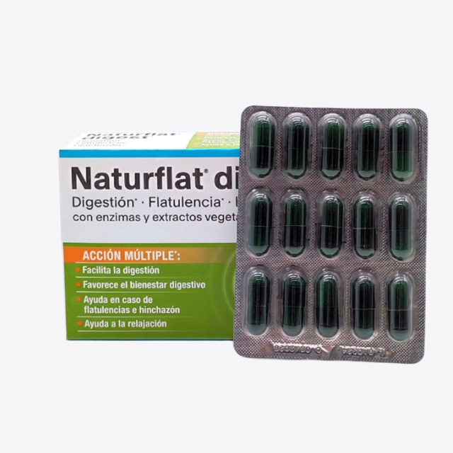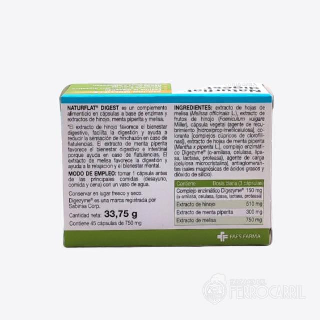 Naturflat digest 45 cápsulas es un complemento alimenticio en cápsulas a base de enzimas y extractos de hinojo, menta piperita y melisa.