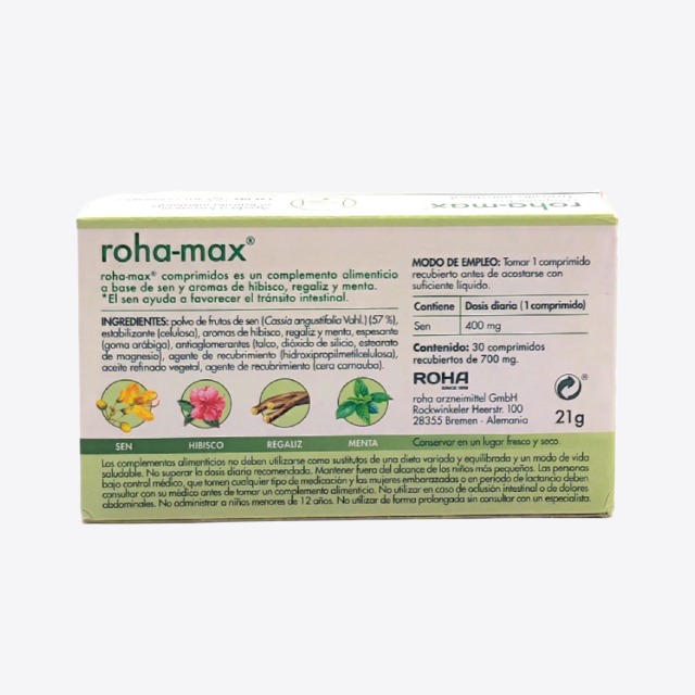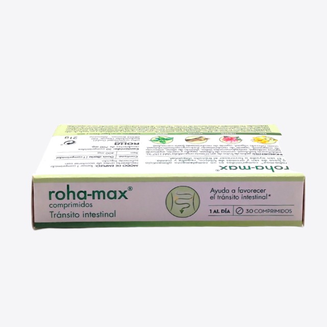 Roha-max 30 comprimidos es un complemento alimenticio a base de sen y aromas de hibisco, regaliz y menta. (El sen ayuda a favorecer el tránsito intestinal).