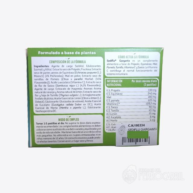 Sediflu garganta 15 pastillas para chupar es un complemento alimenticio a base de Própolis, Equinácea, Miel, Pomelo, Tomillo, Vitamina C y Saúco. La vitamina C contribuye al normal funcionamento del sistema inmunitario.