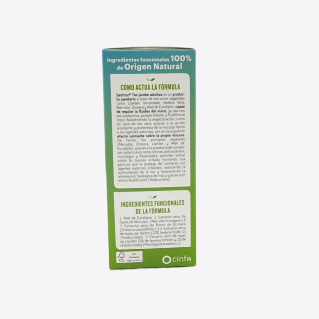 Seditus tos jarabe adultos 150 ml es un producto sanitario a base de extractos vegetales como Llantén lanceolado, Hedera helix, Marrubio, Drosera y Miel de Eucalipto, capaz de regular la fluidez del moco, ya sea con tos productiva, porque hidrata y fluidifica el moco favoreciendo la expectoración, como en caso de tos seca, gracias a la acción emoliente y protectora de la mucosa frente a los agentes externos, con el consiguiente efecto calmante sobre la propia mucosa.