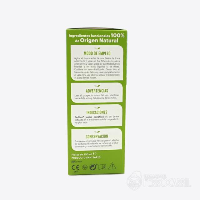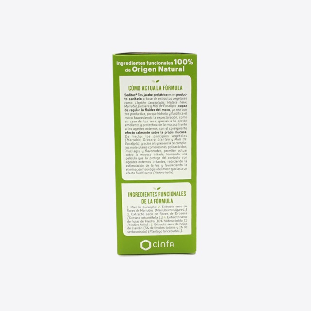Seditus tos infantil 150 ml es un producto sanitario a base de extractos vegetales como Llantén lanceolado, Hedera helix, Marrubio, Drosera y Miel de Eucalipto, capaz de regular la fluidez del moco, ya sea con tros productiva, porque hidrata y fluidifica el moco favoreciendo la expectoración, como en caso de tos seca, grcias a la acción emoliente y protectora de la mucosa frente a los agentes externos, con el consiguiente efecto calmante sobre la propia mucosa.