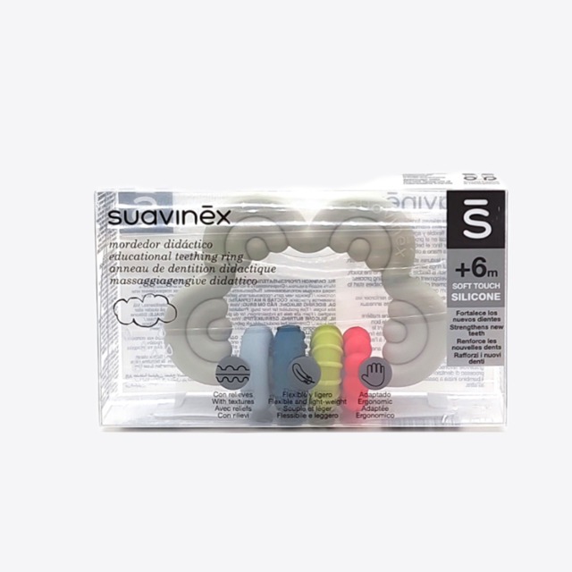 Suavinex mordedor didáctico +6m contiene distintos relieves fortalecen los nuevos dientes; y las coloridas anillas estimulan sus sentidos. Este mordedor, flexible y agradable al tacto, favorece el desarrollo bucal en el proceso de dentición y el desarrollo motor fino: el bebé empieza a trasferir objetivos de una mano a otra.