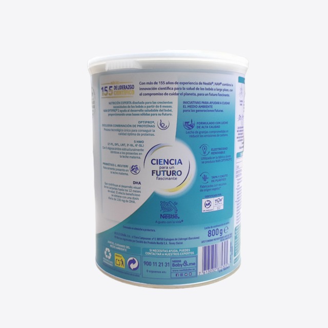 Nan Opti pro 2 800g contiene 5 oligosacáridos estructuralmente idénticos a los presentes en la leche materna. También contiene el probiótico L. Reuteri naturalmente presente en la leche materna.