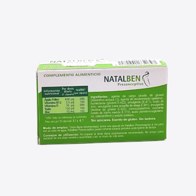 Natalben preconceptivo 30 cápsulas contiene: Ácido fólico, B12, Vitamina D, Yodo y Zinc.