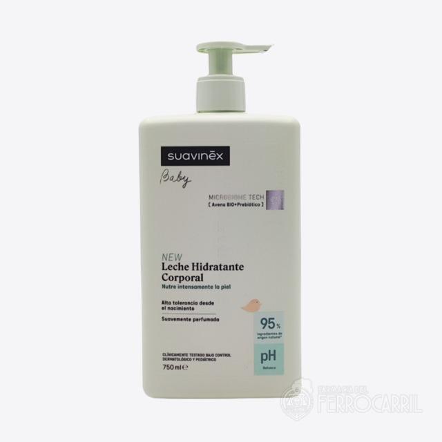 Suavinex leche hidratante corporal 750 ml esta emulsión ligera y sedosa hidrata intensamente la piel del bebé y la protege de la sequedad. Su fórmula, con el complejo natural (Avena BIO + Prebiótico) preserva el equilibrio global de la epidermis, promoviendo su bienestar de fomra inmediata y duradera. Suavemente perfumada. Alta tolerancia desde el nacimiento.