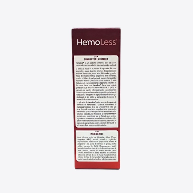 Hemoless crema 50 ml actúa de manera efectiva, proporciona alivio inmediato, suaviza e hidrata la piel perianal, favorece la integridad fisiológica del área y reduce las fisuras molestas. El ácido hialurónico, la manteca de karité y el pantenol presentes en la crema hacen que Hemoless crema 50 ml forme una película protectora que limita la deshidratación de la piel y el contacto con agentes externos irritantes o sensibilizantes. Estos componentes desempeñan un papel importante en la hidratación y el tropismo de la piel, restaurando el tono y la elasticidad de los tejidos y promoviendo el proceso de reparación de la mucosa perianal.