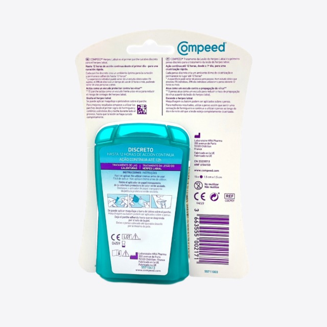 Compeed herpes labial 15 parches gracias a su tecnología Hidrocoloide, actúan de manera rápida y eficaz favoreciendo la cicatrización y reduciendo la formación de costras. Protegen la lesión disminuyendo el picor, el escozor y el enrojecimiento. Además, crean un escudo protector repeliendo el agua y las bacterias, evitando el contagio del herpes labial.