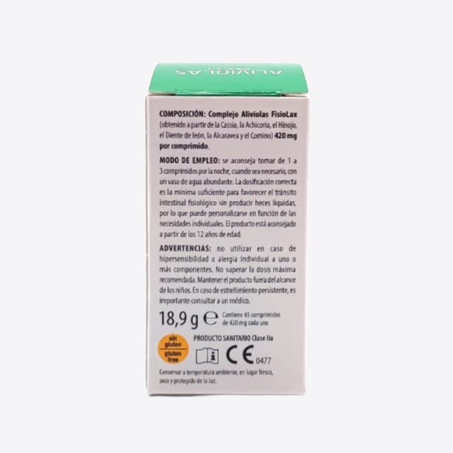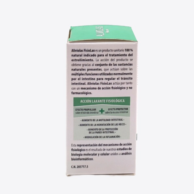 Aliviolas fisiolax comprimidos es un producto sanitario 100% natural indicado para el tratamiento del estreñimiento. La acción del producto se obtiene gracias al conjunto de las sustancias naturales presentes, que actúan sobre las múltiples funciones utilizadas normalmente por el intestino para regular el tránsito intestinal. Aliviolas Fisiolax actúa por tanto con un mecanismo de acción fisiológico y no farmacológico.