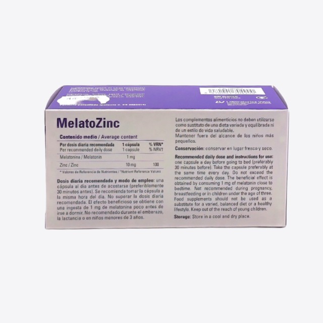 MelatoZinc 60 cápsulas contiene melatonina que contribuye a disminuir el tiempo necesario para conciliar el sueño y el zinc contribuye a la función cognitiva normal.