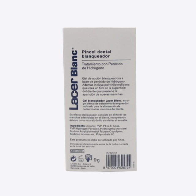 Lacer Blanc Pincel dental blanqueador 9g es un gel de acción blanquadora a base de peróxido de hidrógeno. Además incluye polivinilpirrolidona que crea un gilm en la superficie del diente que previene la aparición de nuevas manchas.