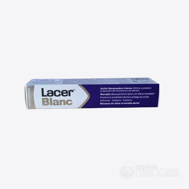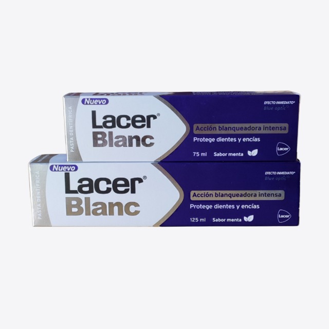 Lacer Blanc pasta dentífrica sabor menta es una pasta blanqueadora, que devuelve a los dientes su color natural, brillo y suavidad sin dañar el esmalte dental. Gracias a su formulación de acción blanqueadora intensa, elimina y previene la aparición de manchas en los dientes. Además, incorpora un agente óptimo azul (Blue optic), que proporciona a los dientes una apariencia más blanca de forma inmediata.