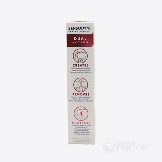 Sensodyne expert protect doble acción 75 ml proporciona protección avanzada para la sensibilidad y las encías clínicamente probada. Trabaja creando una capa protectora para proteger x3 frente a la sensibilidad dental y elimina x3 más placa, en comparación con una pasta de dientes convencional.