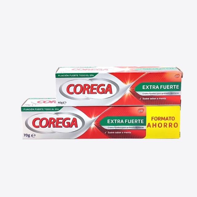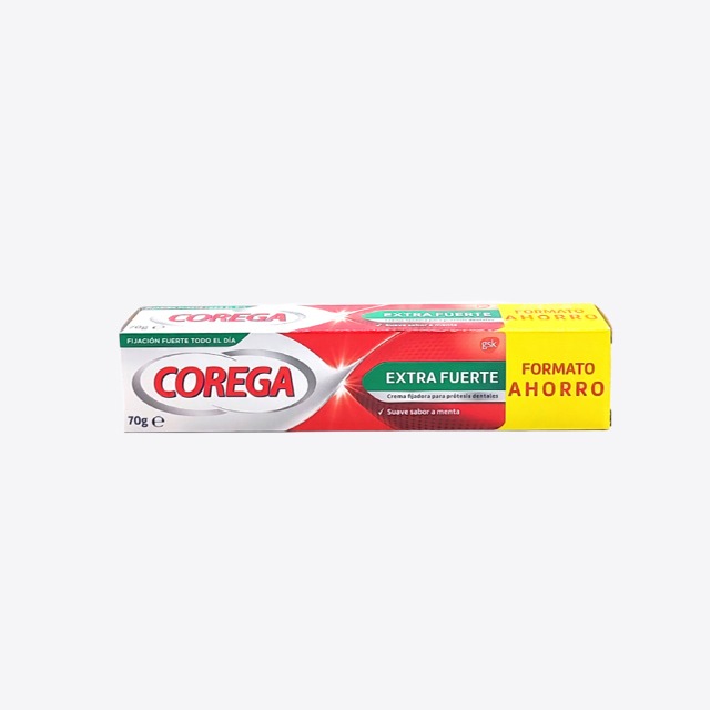 La Corega extra fuerte es una crema fijadora que te ofrece una fijación superior y eficaz de tu prótesis dental durante todo el día.