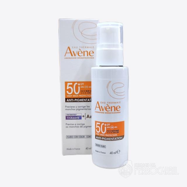 Avene Eau thermale fluido antimanchas spf 50+ 40 ml: Este tratamiento corrige y previene las marcas, al tiempo que unifica la tez con una cobertura ligera. TEXTURA FLUIDA: Tiene una textura ligera con un toque de color, perfecta como base de maquillaje y para aportar luminosidad inmediata a la piel. Su fórmula de alta tolerancia y sin perfume es apta para para pieles sensibles.