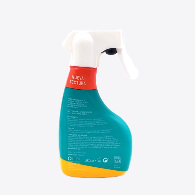Be+ skin protect 50+ infantil spray 250 ml pertenece a una gama fotoprotectora desarrollada a partir de un conjunto de filtros solares que protegen frente a la radiación UVA, UVB, combinada con Be+ Cell Protection Complex, activo patentado por CINFA que protege frente a los daños producidos por la radiación infraroja-A y Visible (HEV).