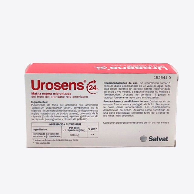 Urosens 60 cápsulas contienen una concentrado de arándano rojo americano (matriz entera micronizada), obteniendo a partir de la totalidad del fruto del arándano (Vaccinium macrocarpon aiton). Los complementos a base de arándono rojo no sustituyen al antibiótico en el tratamiento de la infección aguda. Si tiene dudas sobre este punto, por favor, consúltelo con su médico o farmacéutico de confianza.